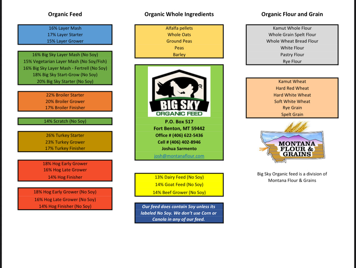 Organic layer mash is made from a combination of grains, protein sources, and minerals. The absence of corn and soy in the feed formula means that the chickens are not exposed to these ingredients which are known to be common allergens. No corn, No Soy, No Canola and Non-Gmo.